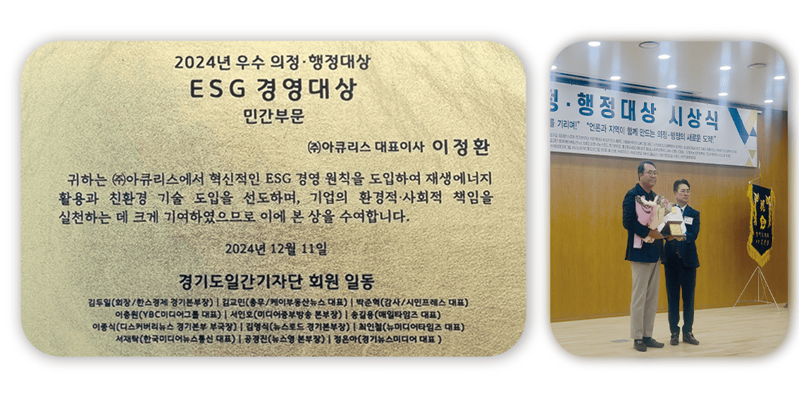 아큐리스 이정환 대표이사는 민간부문의 ‘ESG 경영대상을 수상해 시상식 자리를 빛냈습니다.